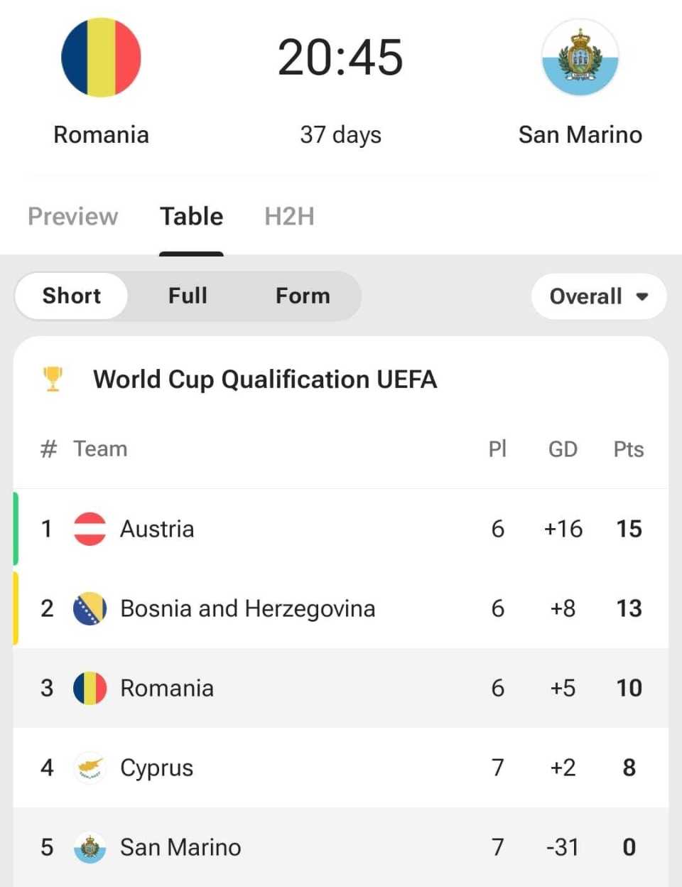 最后一轮,罗马尼亚对阵圣马力诺,波黑对阵奥地利。也就是说,只要罗马尼亚不输波黑,那么末轮要争取大比分战胜圣马力诺,就有机会拿到小组第二,而一旦他们拿到小组第二,那么圣马力诺参加附加赛的希望就又大了一分。