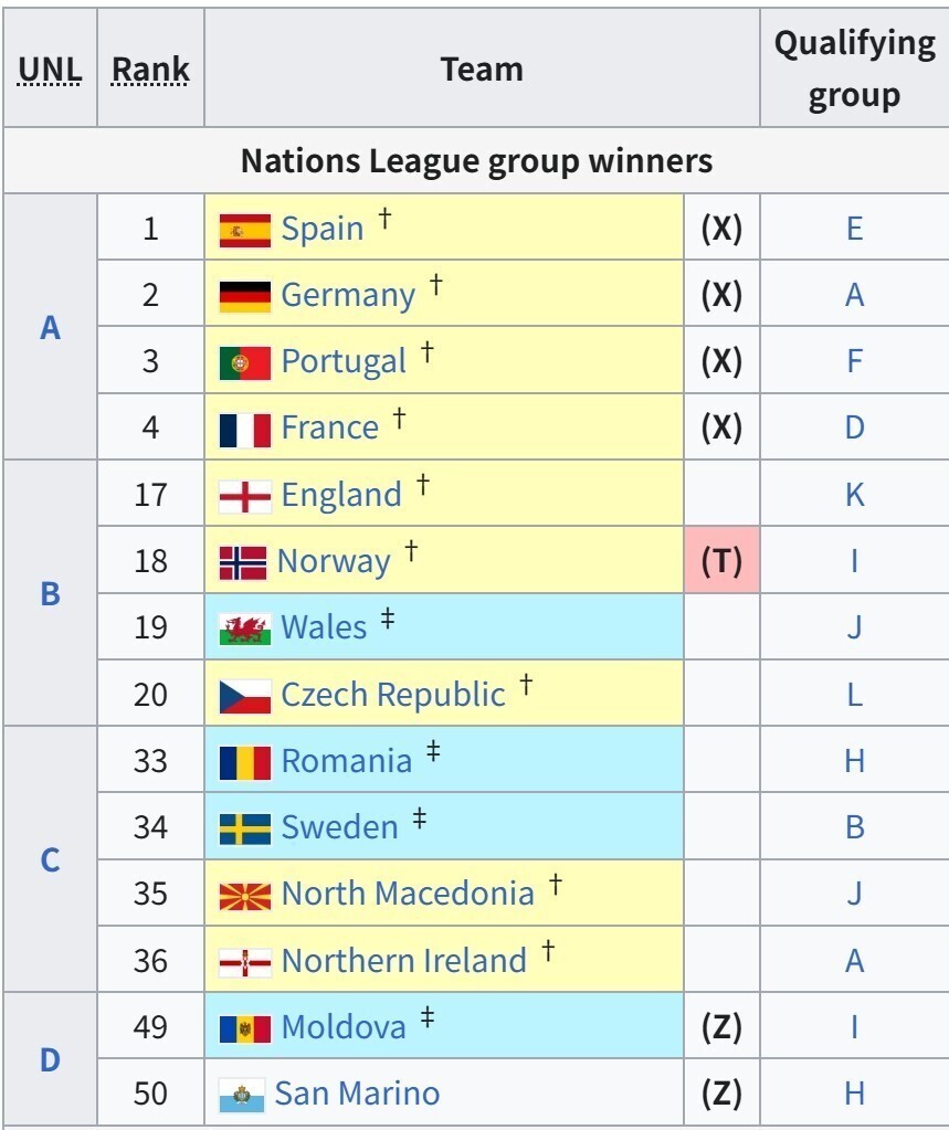 考虑完欧国联各级别的小组第一,名额再按照欧国联总排名顺延,从A级别的小组第二开始:意大利、荷兰、丹麦、克罗地亚、苏格兰等。