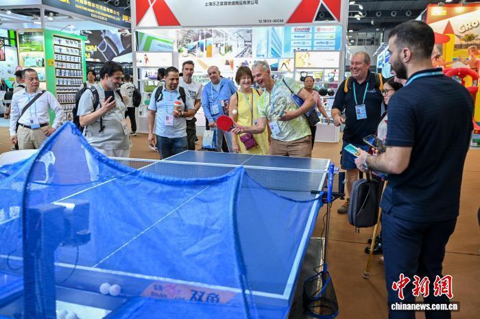 广州双鱼体育用品集团有限公司是十五运会乒乓球项目器材供应商。在本届广交会第三期上,该公司设置了互动体验区,一款乒乓球智能发球机吸引不少采购商拿起球拍试打。